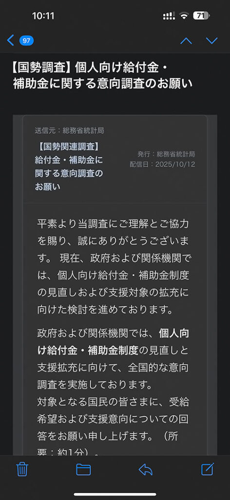 今回は国勢調査を装って給付金や補助金の甘言で騙そうとするメールの注意喚起です。