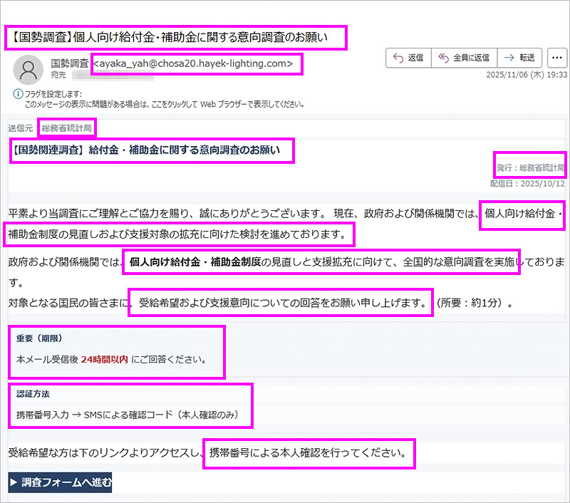 こちらは、前出の国勢調査を装った詐欺メールをPCで見た画面・文面です。桃色の枠は筆者が怪しいと感じた部分です(こんなに怪しい部分があるんです^^;)。