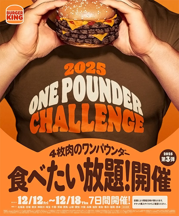 バーガーキングでは、人気のイベント『ワンパウンダーチャレンジ2025』を年3回開催していますが、2025年度の第3回目にして2025年内最終となるチャレンジが12/12(金)~12/18(木)の7日間開催されます。