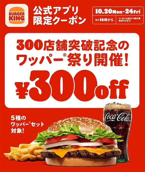 バーガーキングでは、店舗数が300店を突破したことを記念して「ワッパー祭り」を開催します。
