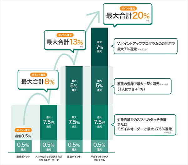 | 対象店還元率 | ・対象店6.5%還元 ・家族ポイント最大5% ・Vポイントアップ10% 合計最大20%(※2) | ・対象店6.5%還元 ・条件達成特典最大12.5% 合計最大20%(※2) | ・対象店7.0% ・条件達成最大7% 合計最大15% (※2) |