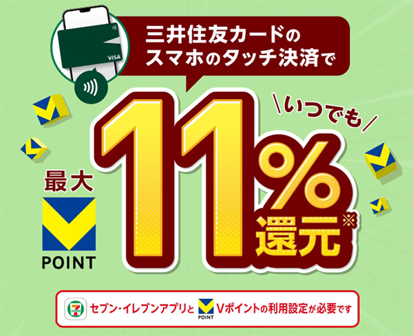 2024年10月15日より、三井住友カードをスマホタッチ決済をセブンイレブンで使用した際のポイント還元が7%→10%にポイントアップしています。家族登録や条件クリアによる上乗せも有効なのでお得です。ただし合計還元率が20%を超えても、還元は最大20%までです。