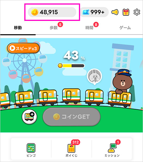 10km移動(自動車や電車)で1ゲージ(車両)が満タンになります。1ゲージCMなしで15コイン、動画視聴で60コインが貰えます。移動には「スピード×3」があって、動画視聴で3時間は3倍速(約3.3km)でゲージが増加します。 - 歩数