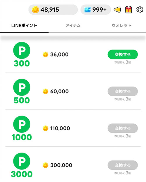 現時点で貯まったコインは「48,915」あるので、LINEポイントに交換の最低数は確保できています(近々交換予定)。