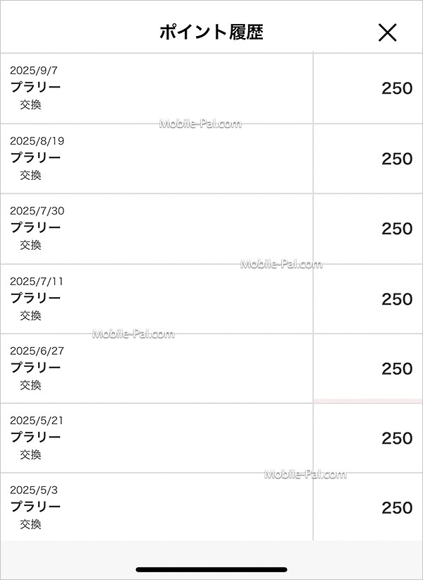 5月~6月は入院や手術があってポイント交換がありませんが、それ以降は月末月初と月半ば、だいたい半月に1回:250Pに交換出来ています。つまり月に500Pのポンタを得ているということになります。交換したポンタは、auPayにチャージして1P=1円で利用できるので、言い換えるとプラリーで毎月500円稼いでいることになります。