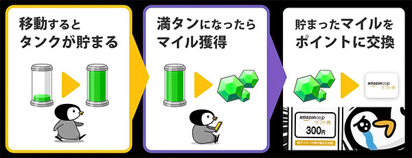 何もしなければ移動しても歩いても何も生じませんが、アプリを入れていれば、移動距離や歩数が何らかのポイントになって帰ってきます。