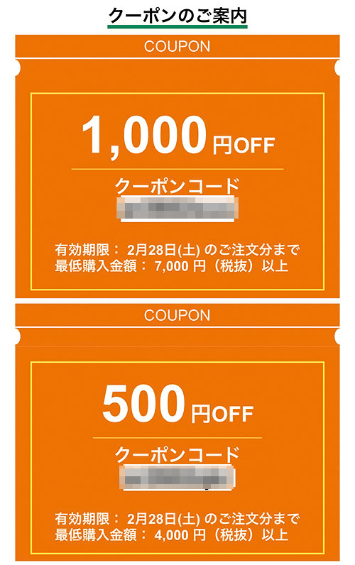 事例のクーポンは、ごく最近のもので、7000円購入で1000円割引(約14%OFF)、4000円で500円割引(約12%OFF)の割引を利用できます(期限内)。もし期限内に使わなかった場合でも、またすぐに次のクーポンが配布されます。