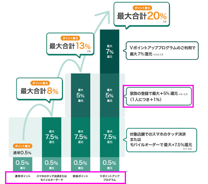 なんと三井住友カードを持っている家族を登録することで、最大5人(5%)まで還元率がアップ!