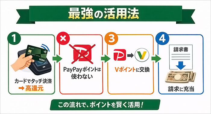 特にPayPayポイントをVポイントに交換してカード請求に充当することで、高還元を維持したまま支出を抑える使い方ができます。