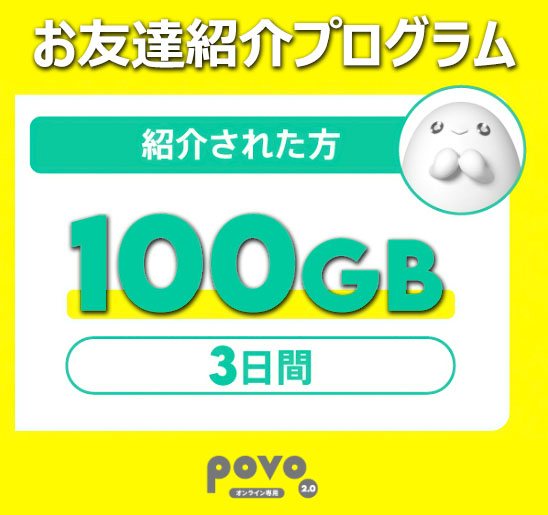 すでにPovoを利用している人の紹介コードを記入して契約すると、100GB/3日間が無料で貰えます。33.3GB/日の大容量で日ごろできない「無駄遣い」や「大盤振る舞い」が可能です。