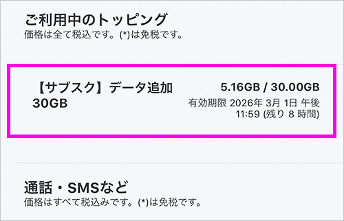 サブスクではない通常トッピングにも『30GB/30日』があります。そちらであれば、月初月末に関わらず30日間利用でき、3/3まで使えたはずでした^^;
