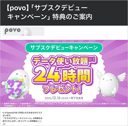 ただ、メイン回線を置いているPovoの契約は継続するので、いずれ何かの事情で通常トッピングを購入する機会はありそうです。キャンペーンの24時間使い放題のプロモコードもありますし。